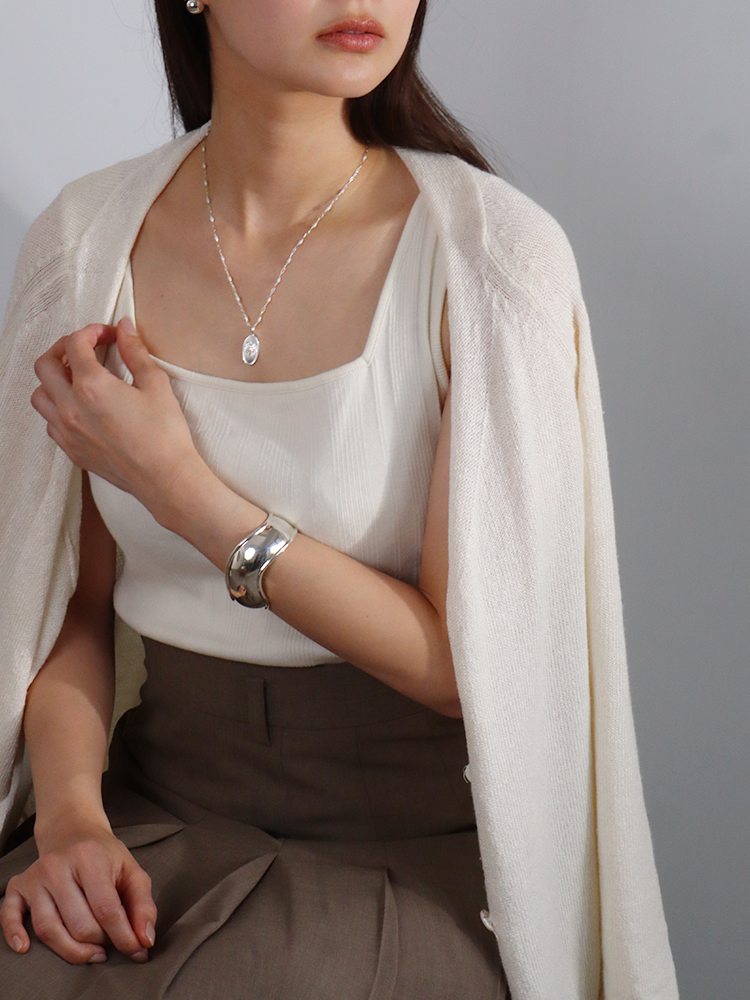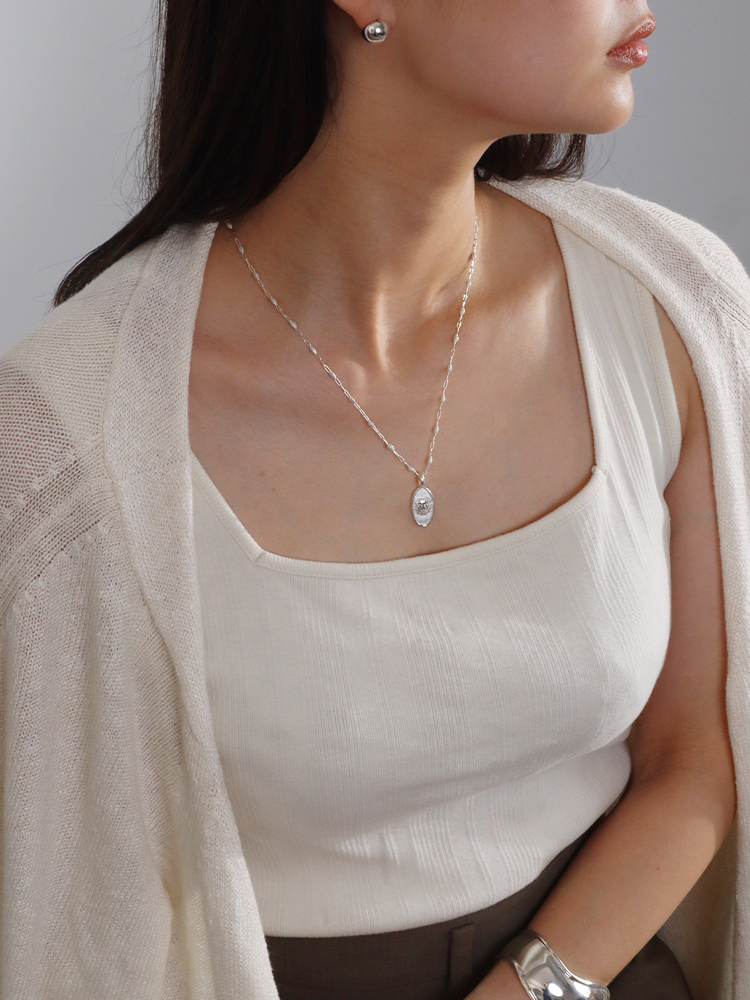 淡水パールをあしらったチェーンが女性らしく、胸元のアクセントとなるアイテム。
