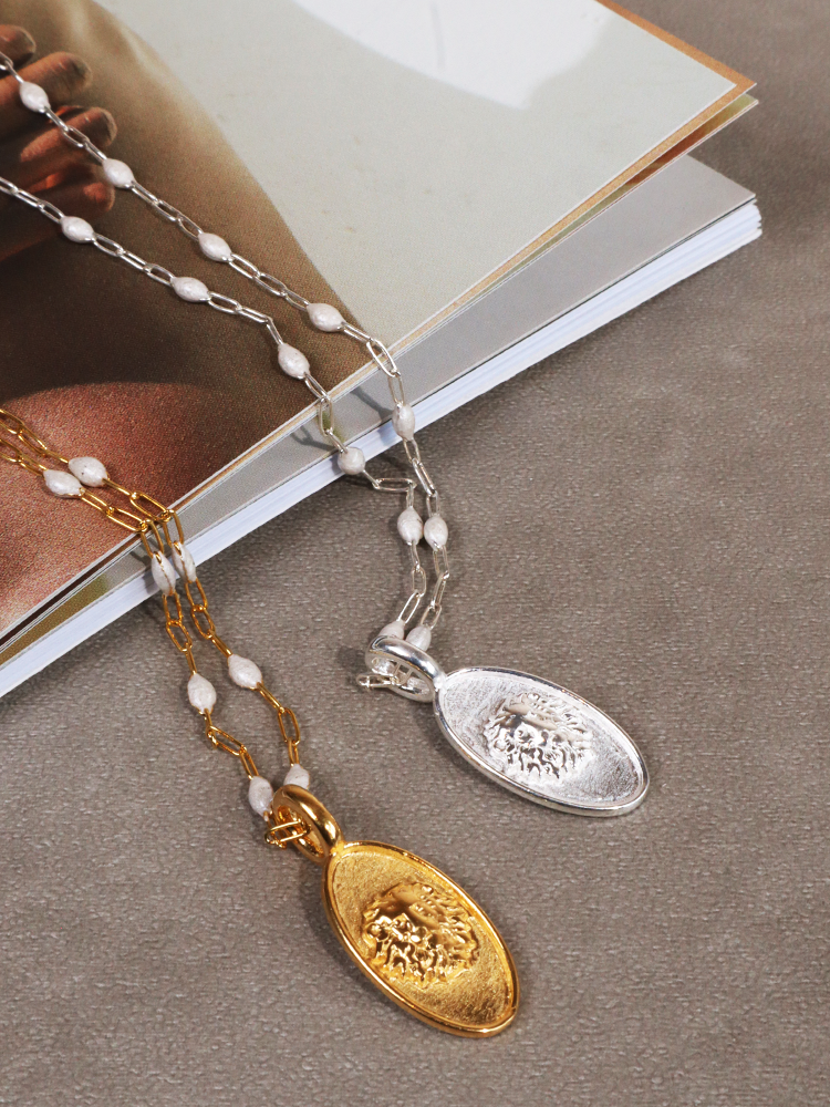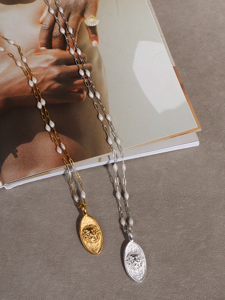 力強いパワーの象徴であるライオンがさりげなくオーバルチャームに浮きたつネックレス。