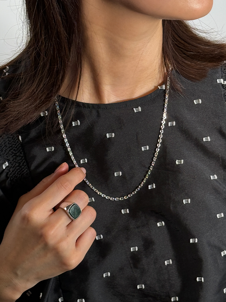 このチェーンはポリッシュ仕上げのスターリングシルバー925製で、表面を強化し変色を防ぐためにホワイトロジウムプレーティングが施されています。