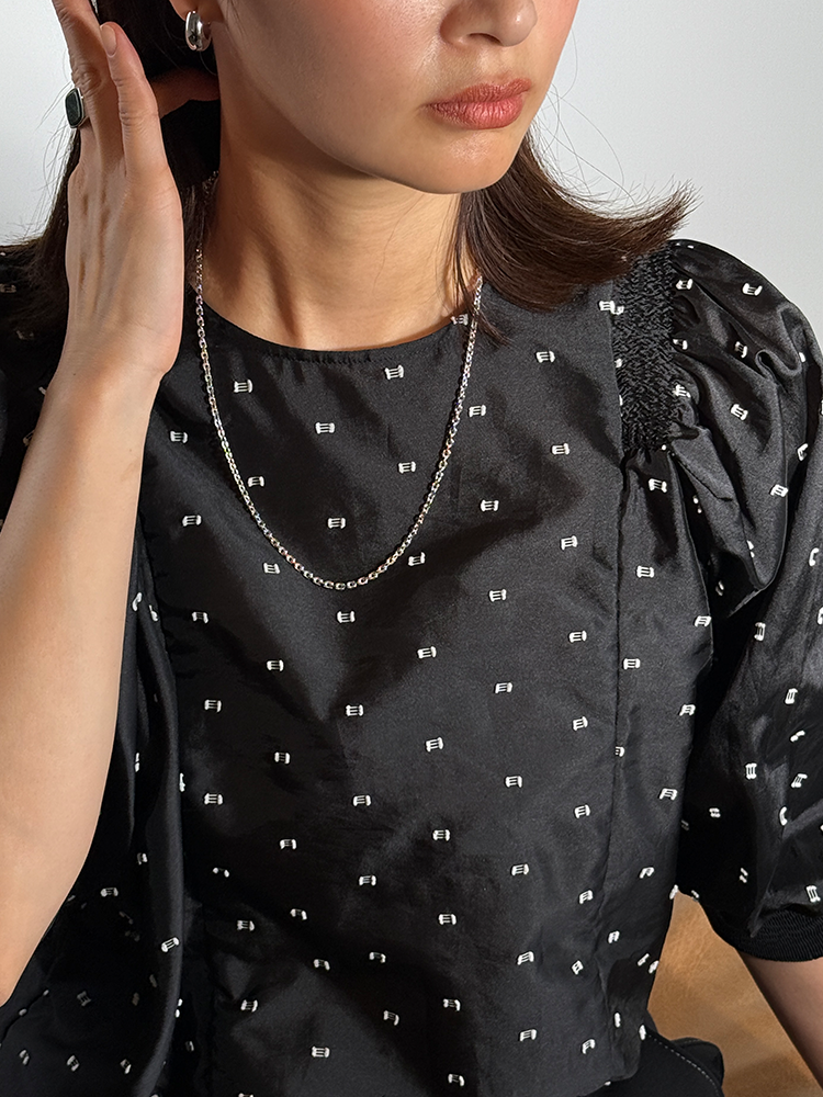 スクエアカットのチェーンが繊細につなぎ合わされ、カスタムデザインの留め具が使用されています。