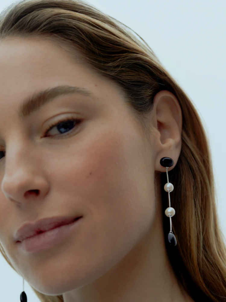 深みのあるブラックオニキスと、やわらかな艶を放つパールが美しく連なるロングピアス。