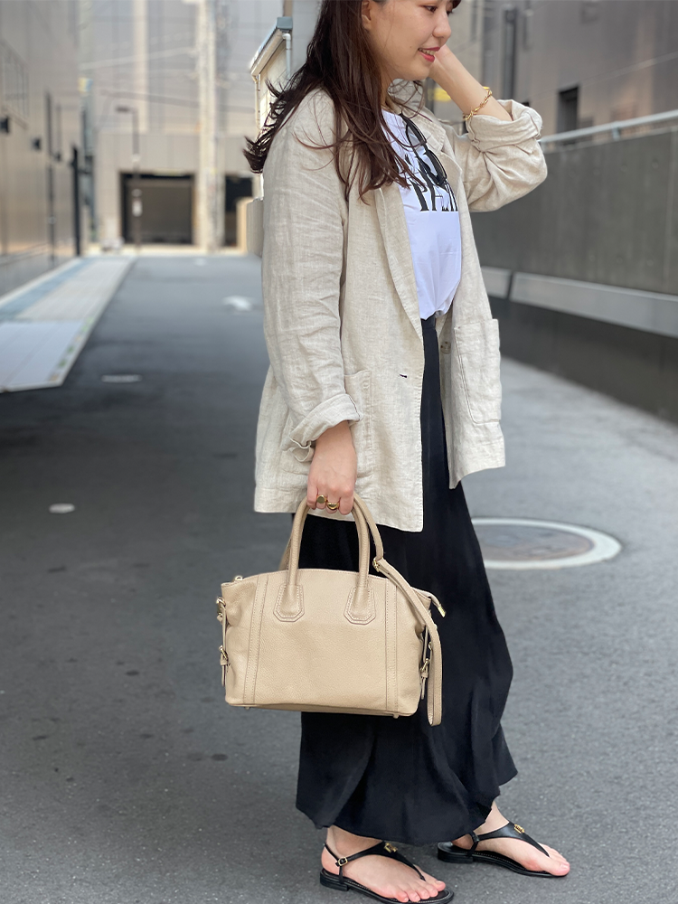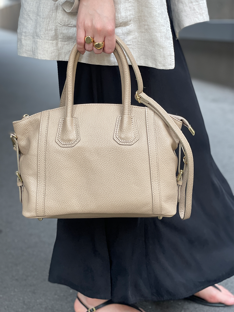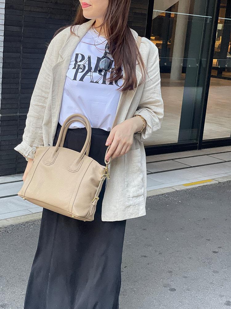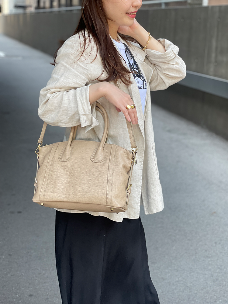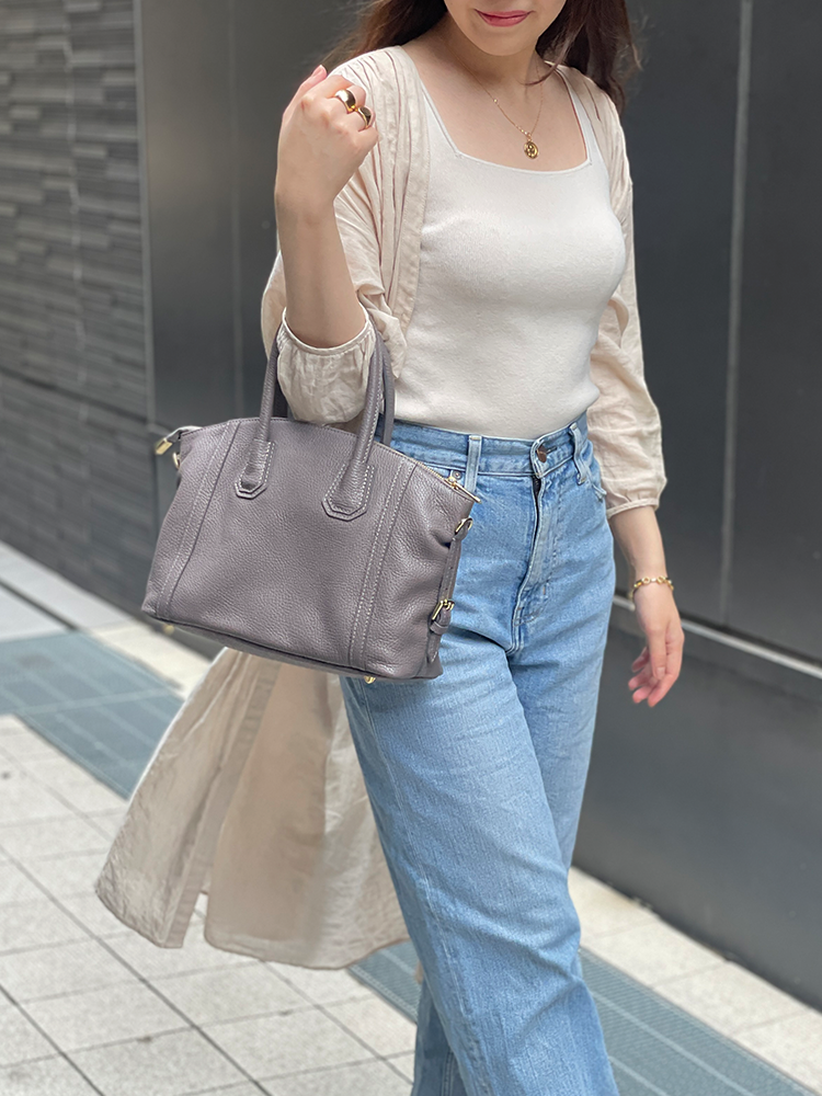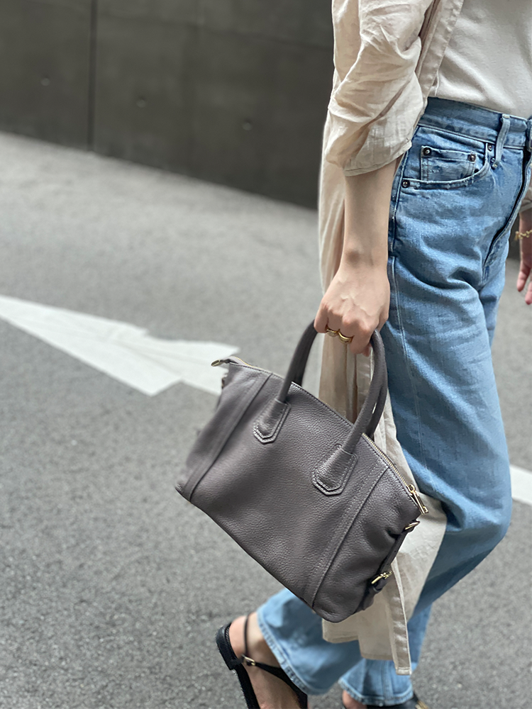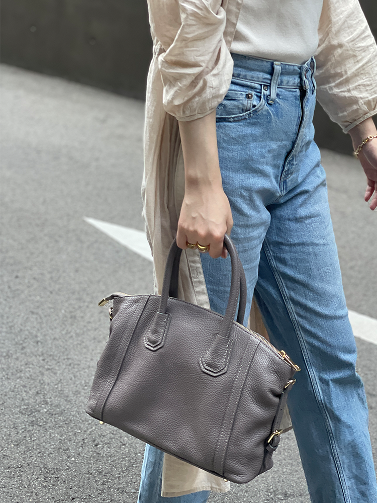 バッグのトップがゆるやかなカーブを描いており、カチっとしすぎないラフな雰囲気のため、通勤はもちろん、普段のカジュアルスタイルにもお使いいただけるデザインです。