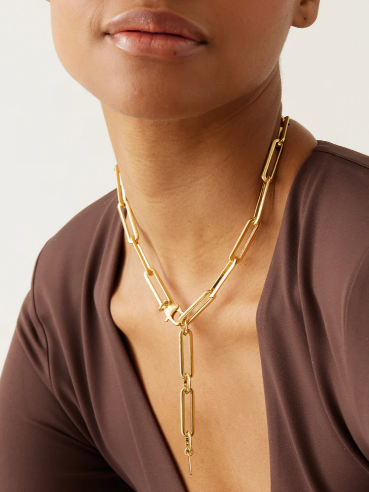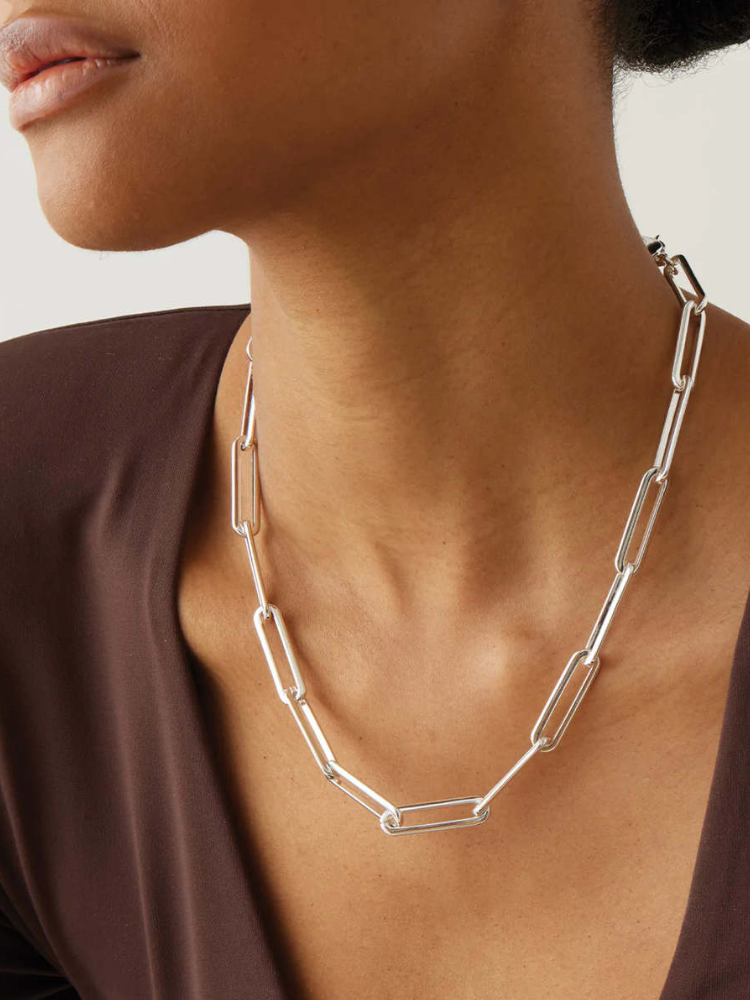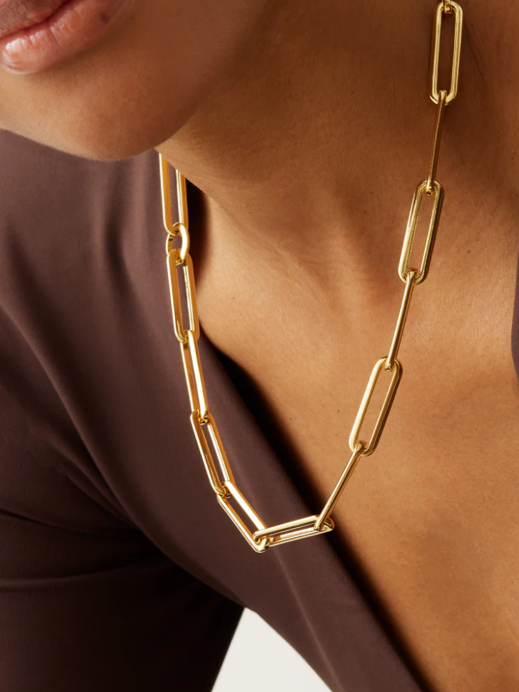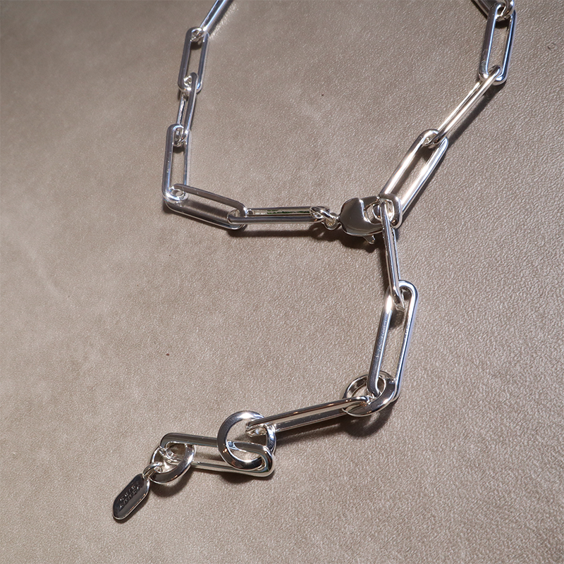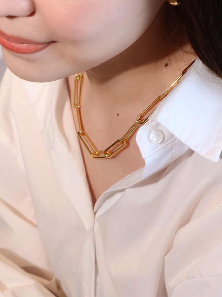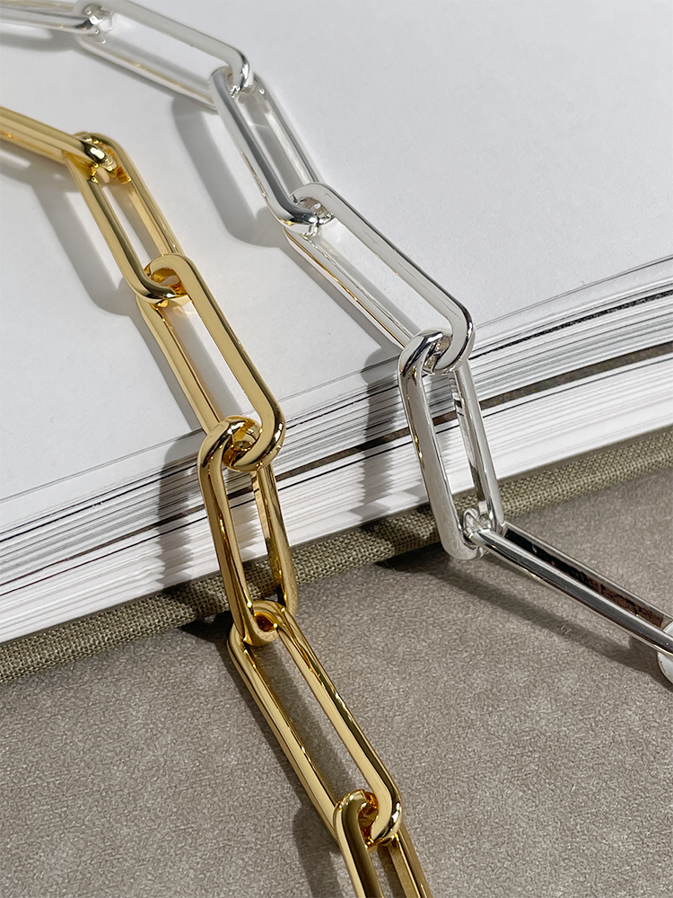 縦長のスクエアリンクでお顔周りをシャープにすっきりと見せてくれるボリュームチェーン。