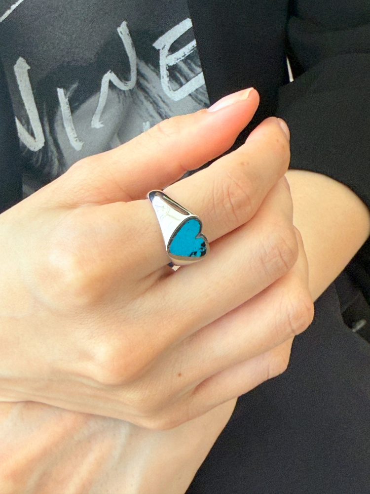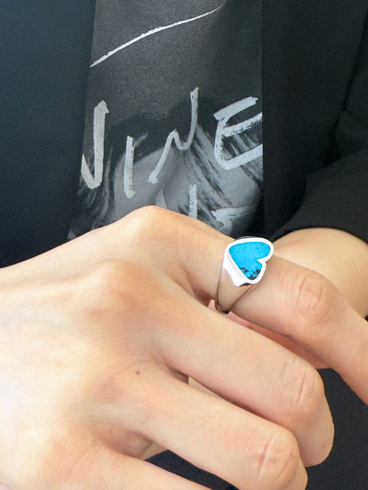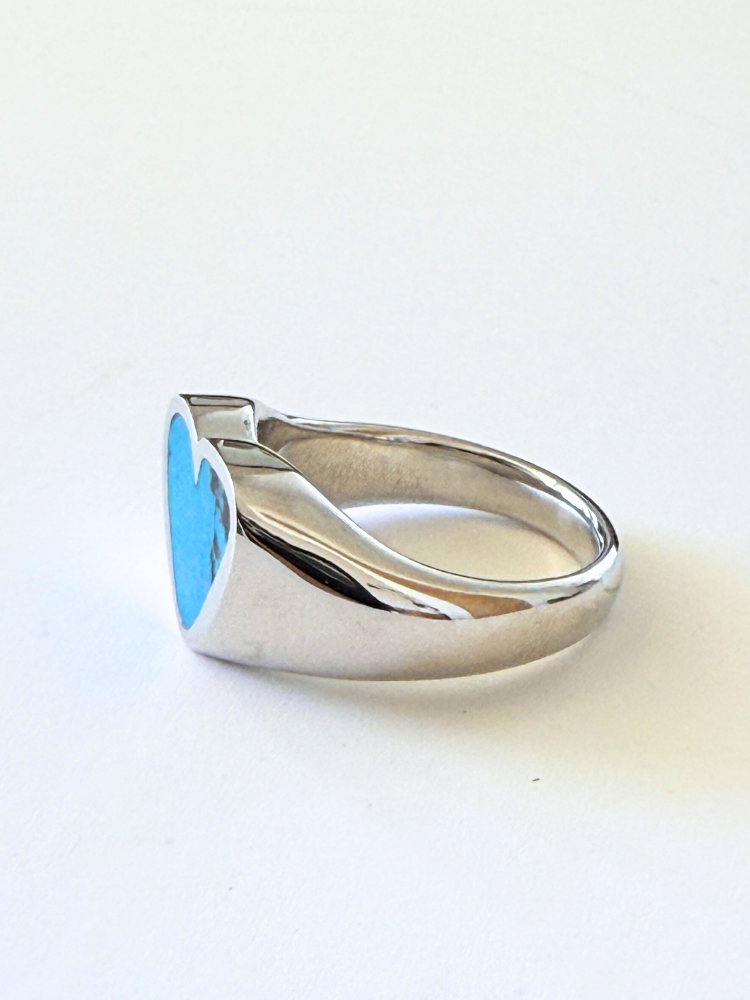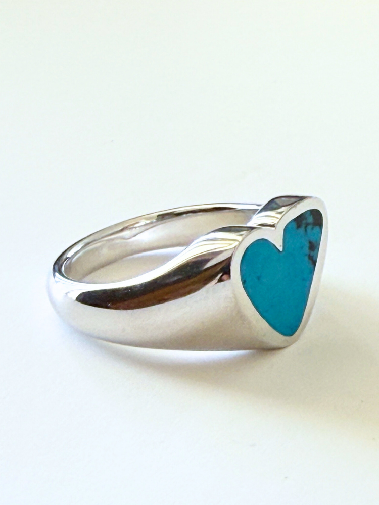 ハートのインレイには鮮やかなターコイズストーンがあしらわれており、天然石ならではの一つとして同じ模様のない表情が、世界にひとつだけの特別感を演出します。