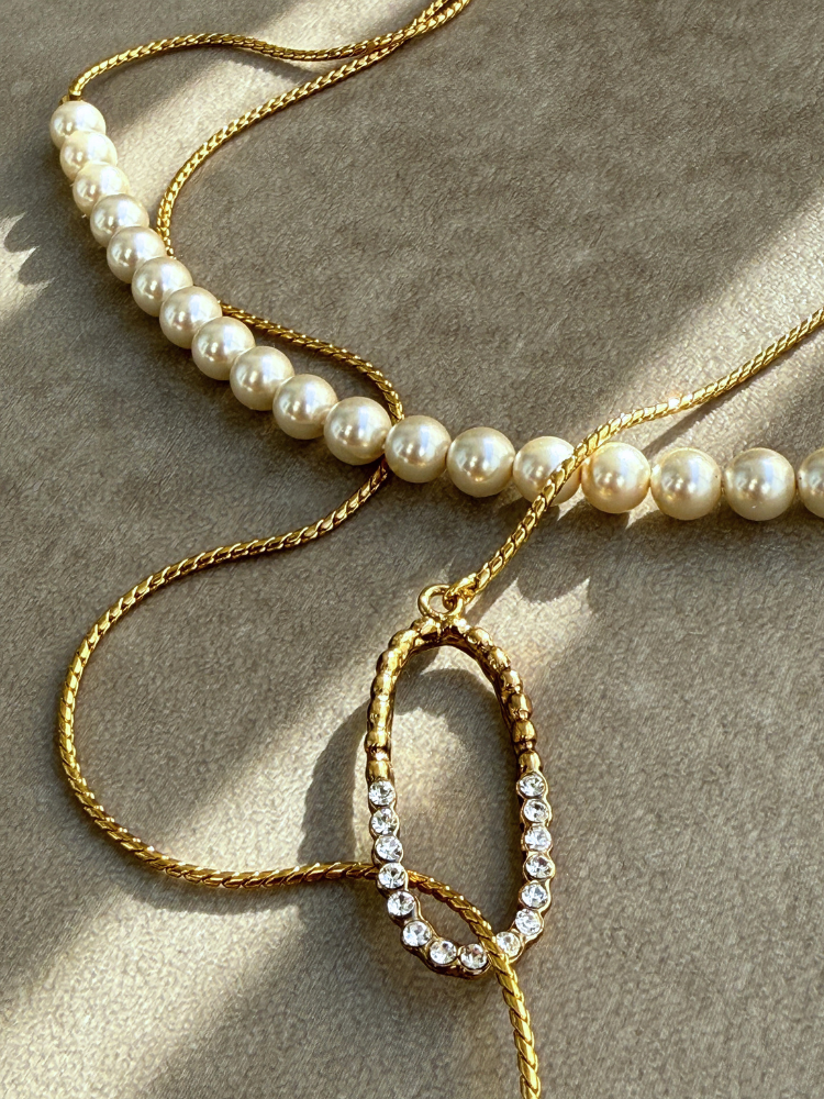 アジャスター仕様のネックレスで、パール部分を短めに、モチーフにチェーンを通すと2連のように見え、スタイリングも楽しめます。