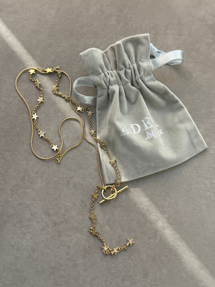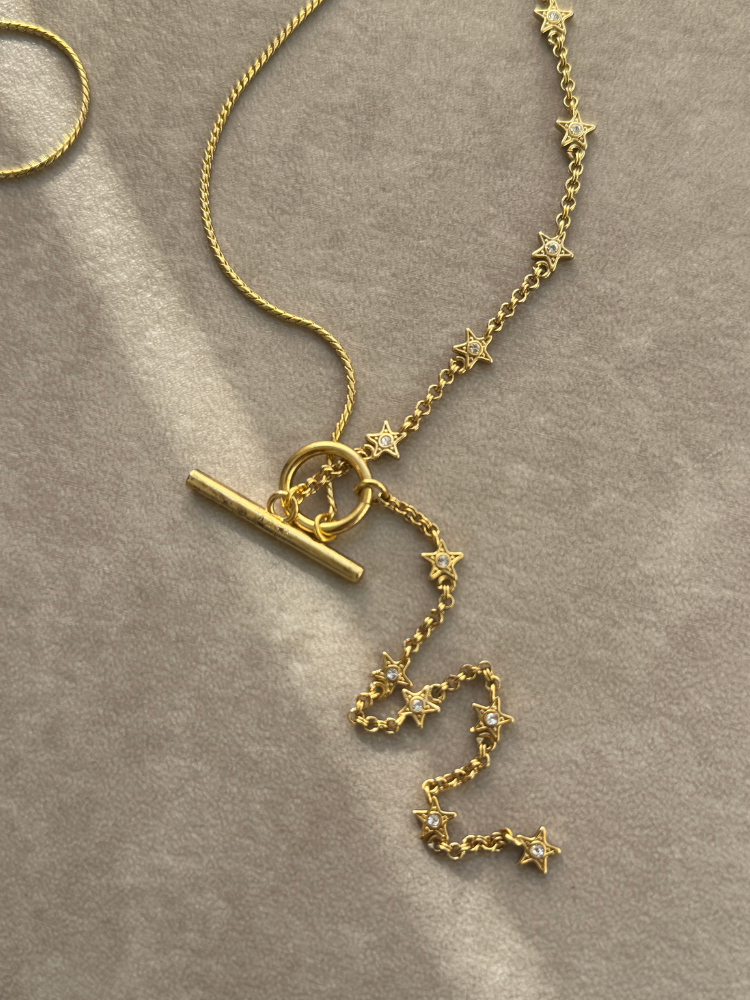 華奢な細いチェーンに星モチーフの連なる女性らしいデザインは、そのままつけることでロングレングスのラリエットとして、チェーンを首2重に巻いてから留めれば2連のショートタイプのラリエットにもなる2WAY仕様です。